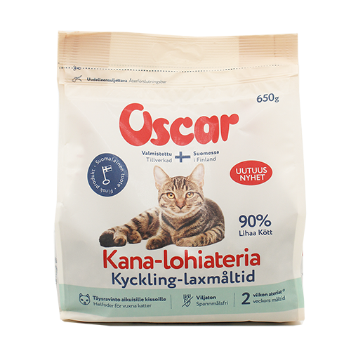 Färsk finskt kycklingkött och kycklingmjöl, lax, ägg, kycklinglever, växtfiber, tranbär, havstång, taurin, vitaminer, mineraler, naturliga antioxidanter: rosmarinextrakt och vitamin E.